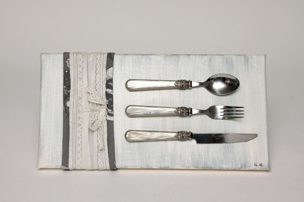 Ich zeige Dir eine Leinwand aus unserem Esszimmer. Der Keilrahmen ist mit Acrylfarbe grundiert, mit Stoffen verziert und schließlich mit dem Besteck versehen.
